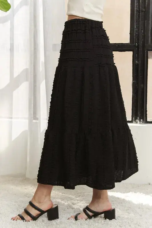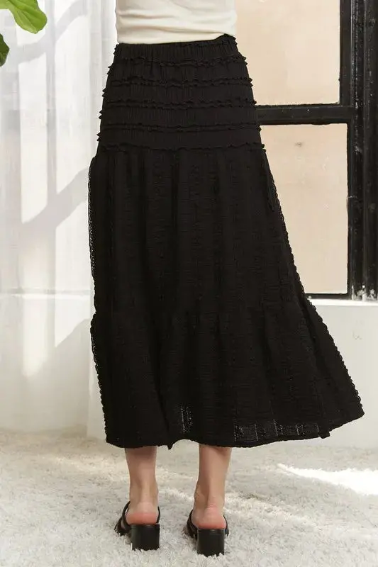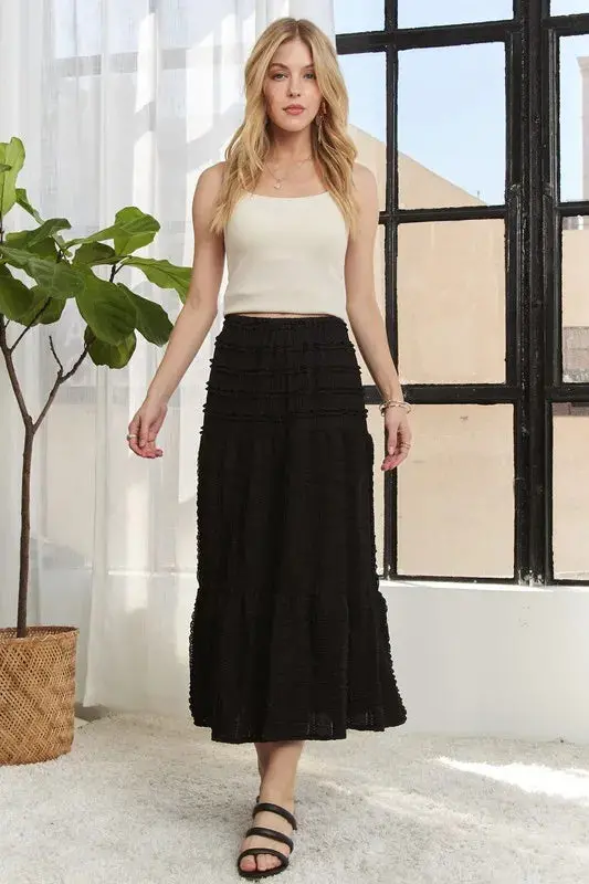 Achieve effortless style and comfort with this elastic waistband tiered midi skirt. The elastic waistband ensures a perfect fit and all-day comfort. The tiered design adds a touch of femininity and movement to your outfit. Pair with a simple top for a chic and versatile look that can easily transition from day to night. Stay on-trend and comfortable with this must-have midi skirt.